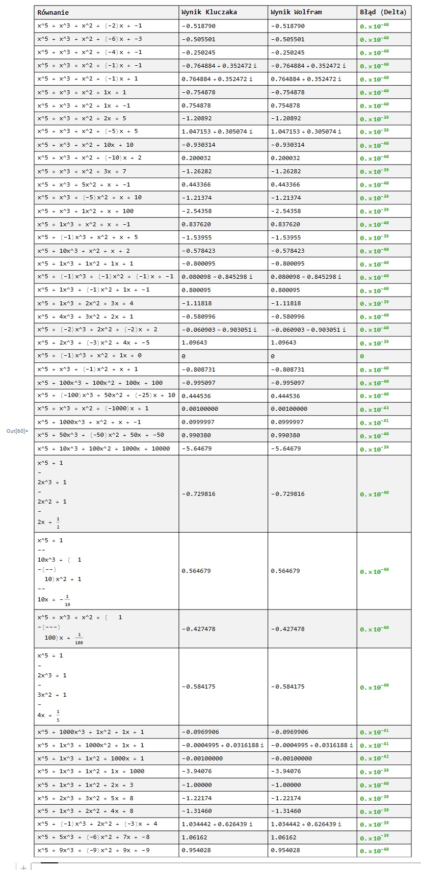 Różnica względem WolframAlpha: \(\displaystyle{ < 10^{-40}}\) - Równanie: \(\displaystyle{ x^5 + x^3 + x^2 - x + 1 = 0}\) (zespolone)