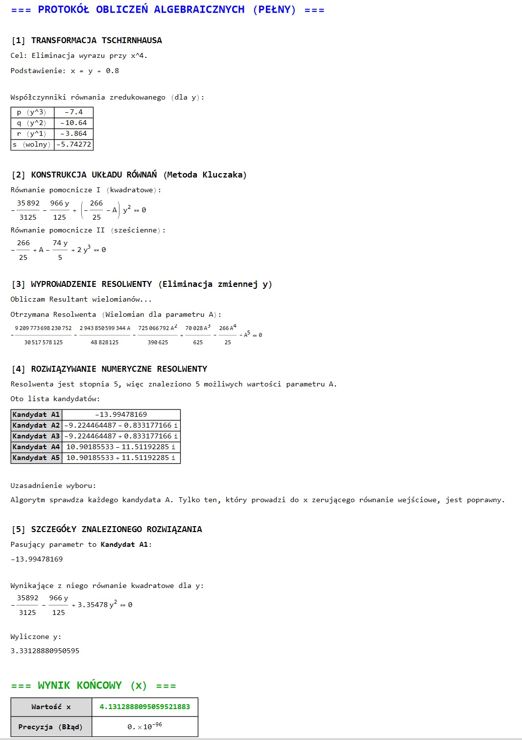 Przeprowadziłem testy na zestawie 50 równań, w tym na tzw. przypadkach "nierozwiązywalnych" (Bringa-Jerrarda) oraz równaniach z pierwiastkami zespolonymi.