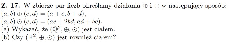 w kontekście wyznaczania elementu neutralnego drugiego działania jest błędne (i to z kilku powodów: zła kolejność kwantyfikatorów, zła postać elementu neutralnego, kwantyfikowanie po liczbach zamiast po parach liczb).powerfullspace pisze: 11 lis 2023, o 19:05 Dla każdego \(\displaystyle{ a, b}\) ze zbioru liczb wymiernych do kwadratu, istnieje liczba \(\displaystyle{ n}\) z tego samego zbioru, że \(\displaystyle{ (a,b) \odot (n,n) = (a,b).}\)