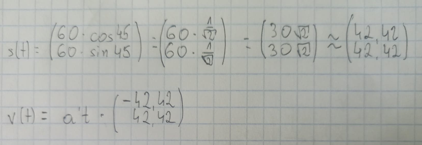\(\displaystyle{ s(t) = \begin{pmatrix} x(t) \\ y(t) \end{pmatrix} = \begin{pmatrix} 60 \cos(\alpha(t)) \\ 60 \sin(\alpha(t)) \end{pmatrix}}\).