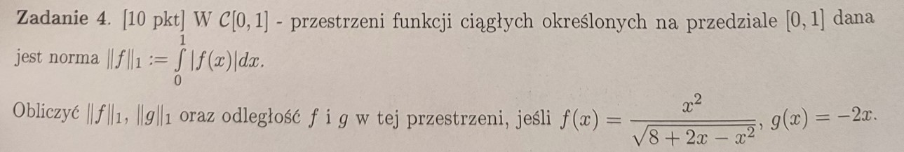 Zgaduję, że policzenie \(\displaystyle{ \|f\|_1}\) to tu jedyny problem? Bo reszta wydaje się wstawianiem rzeczy do wzorów. Więc całkę