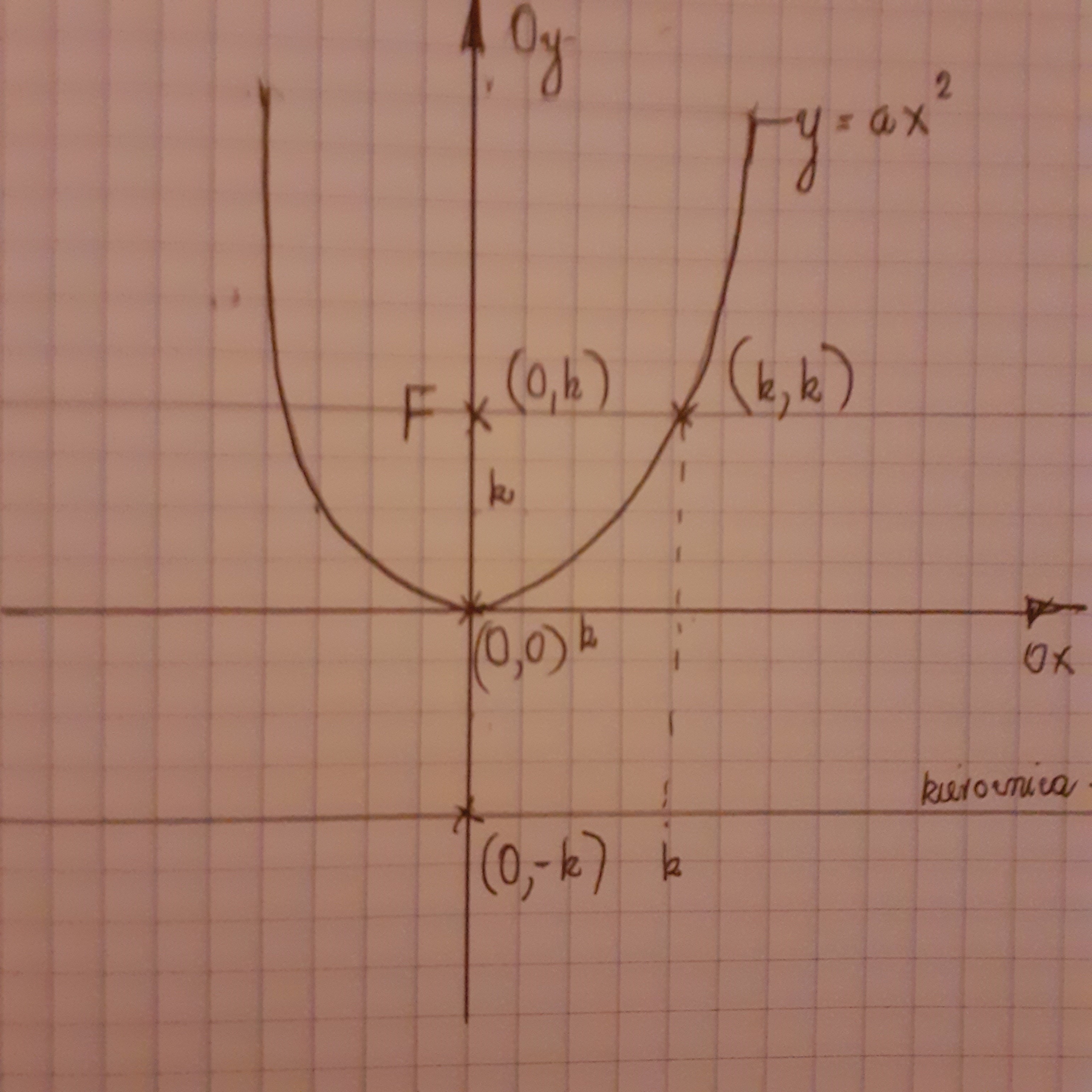 Przecież punkt `(k,k)` nie może leżeć na paraboli, bo jego odległość od ogniska jest równa `k` a od kierownicy `2k`