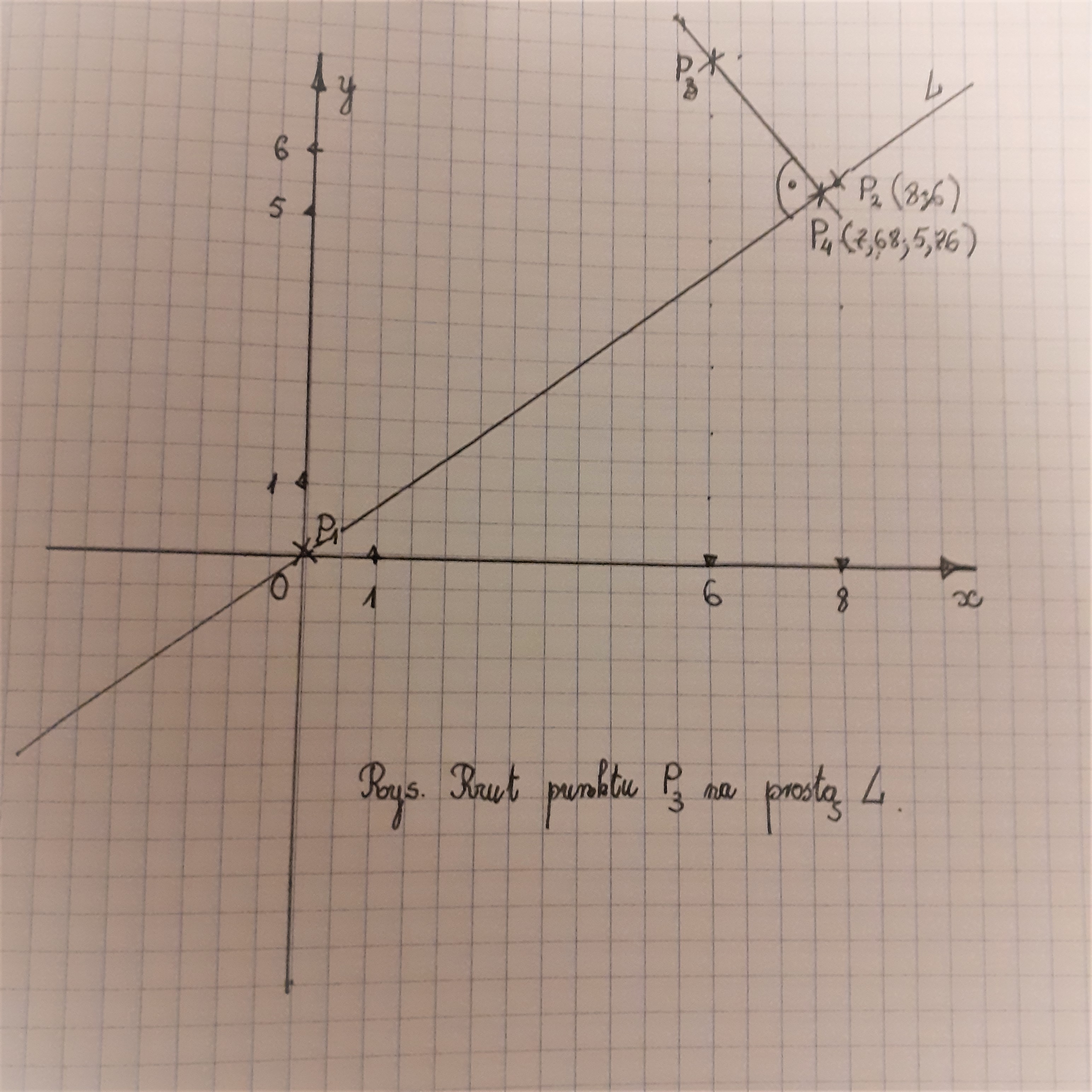 Zadanie można rozwiązać metodą szkolną, pisząc równanie prostej \(\displaystyle{ y = \frac{6}{8}x = \frac{3}{4}x }\) i do niej prostą - prostopadłą, przechodzącą przez punkt \(\displaystyle{ P_{3} = (6,8)}\) o równaniu \(\displaystyle{ y_{\perp} = - \frac{4}{3} + 16. }\)