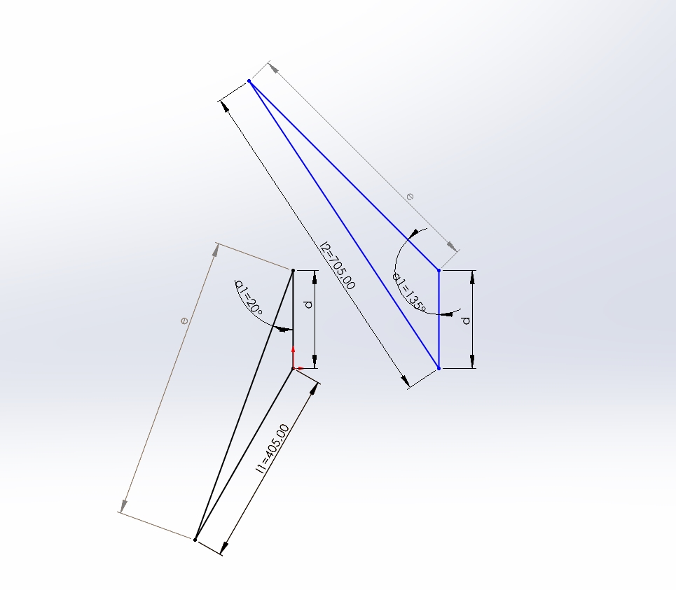 \(\displaystyle{ d ^{2}+e ^{2}=l_1 ^{2}+ 2\cdot d\cdot e\cdot \cos( \alpha_1)=l_2 ^{2}+ 2\cdot d\cdot e\cdot \cos( \alpha_2) }\)