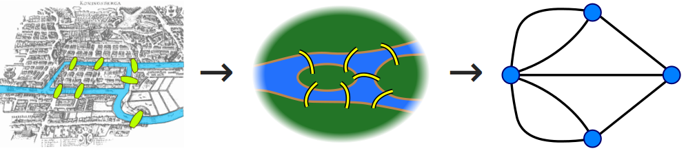Teraz spójrzmy się na mapę Królewca. Tworzymy na tej mapie graf. Wierzchołkami tego grafu będą poszczególne lądy, a krawędziami mosty. Z twierdzenia Eulera wiemy, że warunkiem koniecznym na istnienie cyklu Eulera w grafie jest to, aby każdy wierzchołek grafu z wyjątkiem najwyżej dwóch musi mieć parzysty stopień. Mamy aż cztery wierzchołki stopnia nieparzystego stąd nasz graf nie posiada cyklu Eulera. Tym samym rozwiązaliśmy zagadkę o 7 mostach.