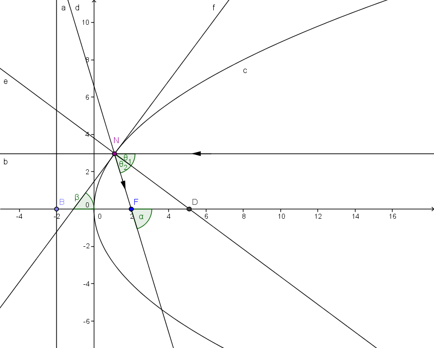 Z równości kątów naprzemianległych dostajemy \(\displaystyle{ |\angle \mathrm{NDF}|=\theta_1}\). Oznaczmy ten kąt przez \(\displaystyle{ \theta}\) Poprowadźmy styczną \(\displaystyle{ f}\) do krzywej w punkcie \(\displaystyle{ N}\). Styczna ta jest prostopadła do prostej \(\displaystyle{ \mathrm{ND}}\). Zatem \(\displaystyle{ \beta=90^{\circ}-\theta}\) Ponadto mamy \(\displaystyle{ |\angle \mathrm{BFN}|=\alpha=2\theta}\).