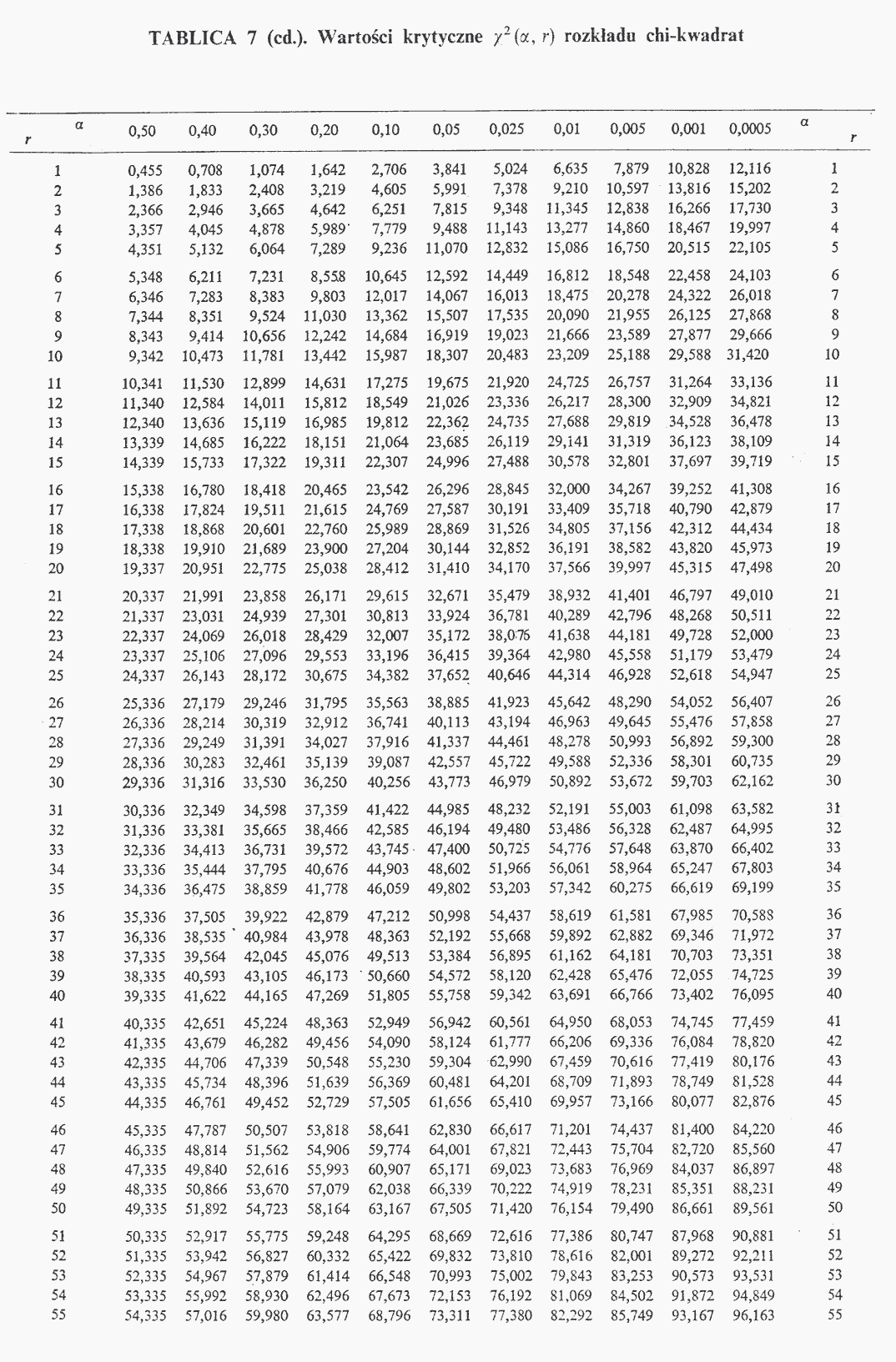 zobacz część 1 oraz część 2 tablic rozkładu \(\displaystyle{ \chi^2}\) (warunki mogą się różnić, w zależności od stosowanych tablic).\(\displaystyle{ \chi^2(c_2)= \frac{ \alpha}{2}}\)