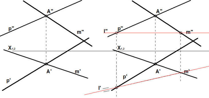 Na rysunku z lewej strony odzwierciedlono rzuty poziome prostych \(\displaystyle{ p', m'}\) na rzutnię poziomą i rzuty pionowe prostych \(\displaystyle{ p",m''}\) na rzutnię pionową. Bowiem mamy pewnik- warunkiem dwóch prostych przecinających się jest ich wspólny punkt przecięcia- tutaj punkt A(A',A") leżący na prostej prostopadłej do krawędzi - osi rzutów\(\displaystyle{ x _{1,2} }\)