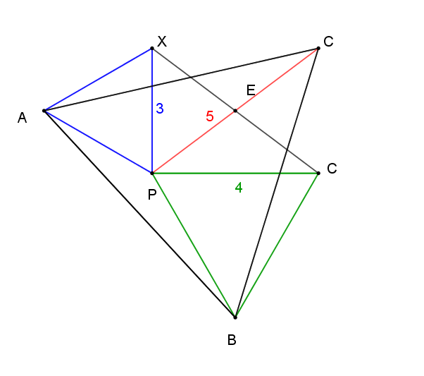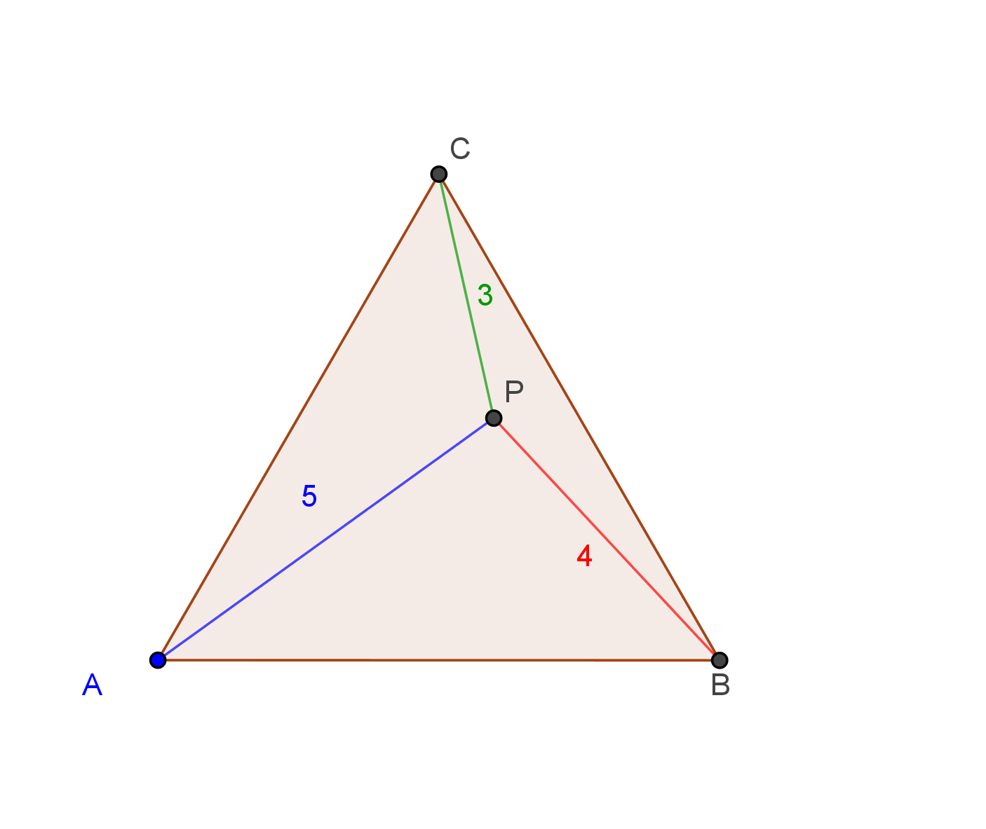 Konstruujemy trójkąt \(\displaystyle{ PXC}\), w którym \(\displaystyle{ PX=4}\), \(\displaystyle{ XC=5}\) oraz \(\displaystyle{ PC=3}\) (łatwo zauważyć, że jest to trójkąt prostokątny, choć nie ma to szczególnego znaczenia).Następnie budujemy trójkąt równoboczny \(\displaystyle{ PXB}\) tak, aby punkty \(\displaystyle{ B}\) i \(\displaystyle{ C}\) leżały po przeciwnych stronach prostej \(\displaystyle{ PX}\). Można dowieść, że trójkąt równoboczny \(\displaystyle{ ABC}\) taki, że punkty \(\displaystyle{ A}\) (punkt ten wymaga konstrukcji) oraz \(\displaystyle{ P}\) leżą po tej samej stronie prostej \(\displaystyle{ BC}\) spełnia warunki zadania (z punktem \(\displaystyle{ P}\) w jego wnętrzu).