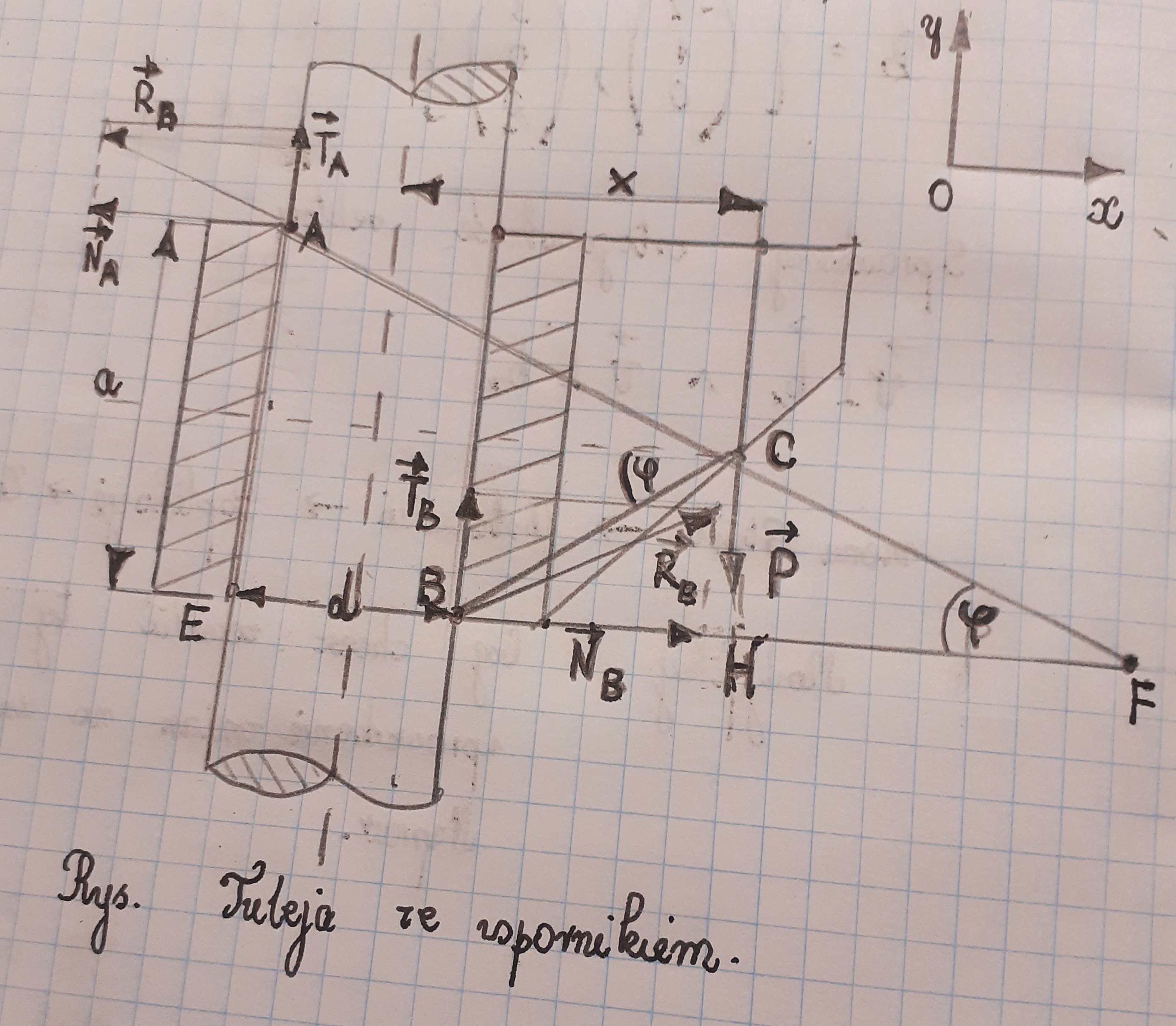 Czarna magia te stożki tarcia. Gdzie ta siła \(\displaystyle{ P}\), może leżeć żeby była równowaga? Bo ona jest prostopadła do osi stożka, ale jej linia działania nie leży w całości w tych stożkach tarcia. Czy ważny jest też punkt przyłożenia siły \(\displaystyle{ P}\), czy tylko jej linia działania? A jeśli \(\displaystyle{ x}\) będzie mniejsze od tej wartości, to co się stanie? Równowaga zostanie zachwiana na skutek czego?