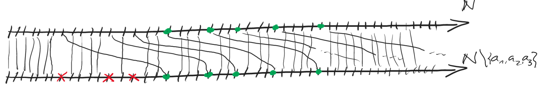 Patrz rysunek. Ogólny pomysł jest taki, że zbiory \(\displaystyle{ \NN}\) oraz \(\displaystyle{ \NN \setminus \left\{ \text{kilka elementów}\right\} }\) są bardzo podobne. Więc "zwykle" \(\displaystyle{ \text{id}}\) będzie dobra jako bijekcja. Ale mamy kilka niechcianych elementów w przeciwdziedzinie (czerwone \(\displaystyle{ x}\)-sy). Więc wybrałem zbiór nieskończony którego najmniejszy element jest większy od największego niechcianego \(\displaystyle{ x}\)-sa (zielony zbiór). Więc idę sobie identycznością, aż napotkam pierwszego niechcianego gościa w przeciwdziedzinie. Wtedy zapisać przypisać mu właśnie tę niechcianą wartość przypisuję pierwszą wartość z zielonego zbioru. I kontynuuję, aż znów nie spotkam niechcianej wartości. Po pewnym skończonym czasie przypiszę ostatniej niechcianej wartości coś z zielonego zbioru unikając tym samym kłopotu, iż wartość ta miała by się znaleźć w obrazie. Jednak po pewnym czasie w dziedzinie zacznę napotykać zielone wartości którym nie będę mógł przypisać tego samego by nie popsuć injektywności. To jednak nie problem bo zbiór zielony był nieskończony więc mogę przypisać wartość najmniejszą z zielonego zbioru która nie została jeszcze wykorzystana.