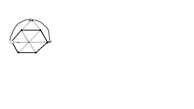 Możemy założyć, że nasz sześciokąt foremny leży na płaszczyźnie \(\displaystyle{ \mathbb{R}^2}\), ma środek w punkcie \(\displaystyle{ O=(0,0)}\) oraz wierzchołek w punkcie \(\displaystyle{ (2,0)}\). Gdy żaba z punktu \(\displaystyle{ F}\) skacze ponad żabą w punkcie \(\displaystyle{ P}\) do punktu \(\displaystyle{ F_0}\), to