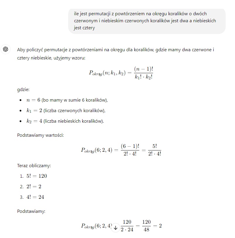 Pokażę zrzut ekranu jak liczy sztuczna inteligencja proste zadanie na temat permutacji koralikowych z powtórzeniem w sumie żenada...