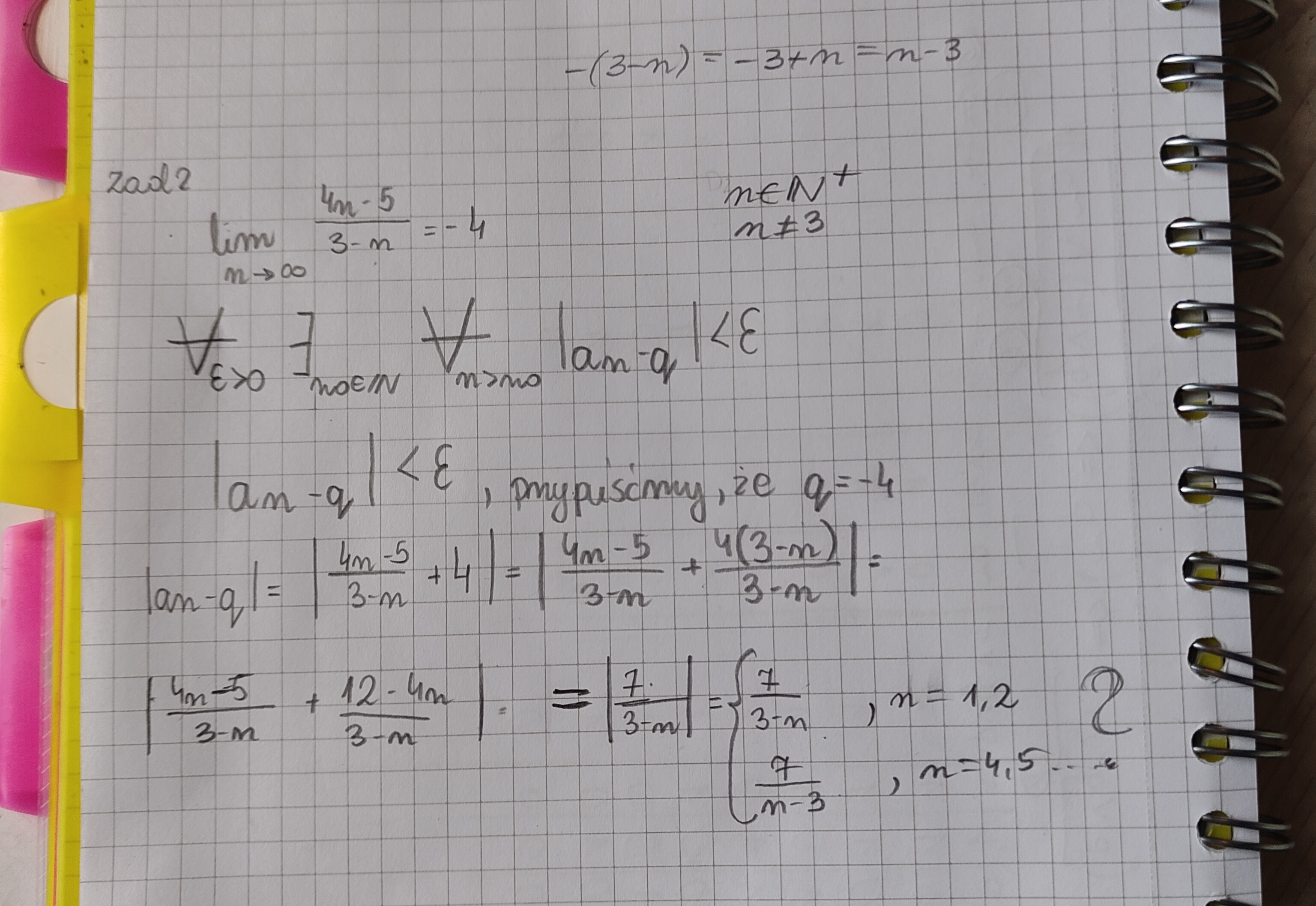 Witam, czy mogę poprosić o pomoc z granica ciągu z definicji? Mam problem z pozbyciem się wartości bezwzględnej. Czy tutaj trzeba rozpisać dwa przypadki?