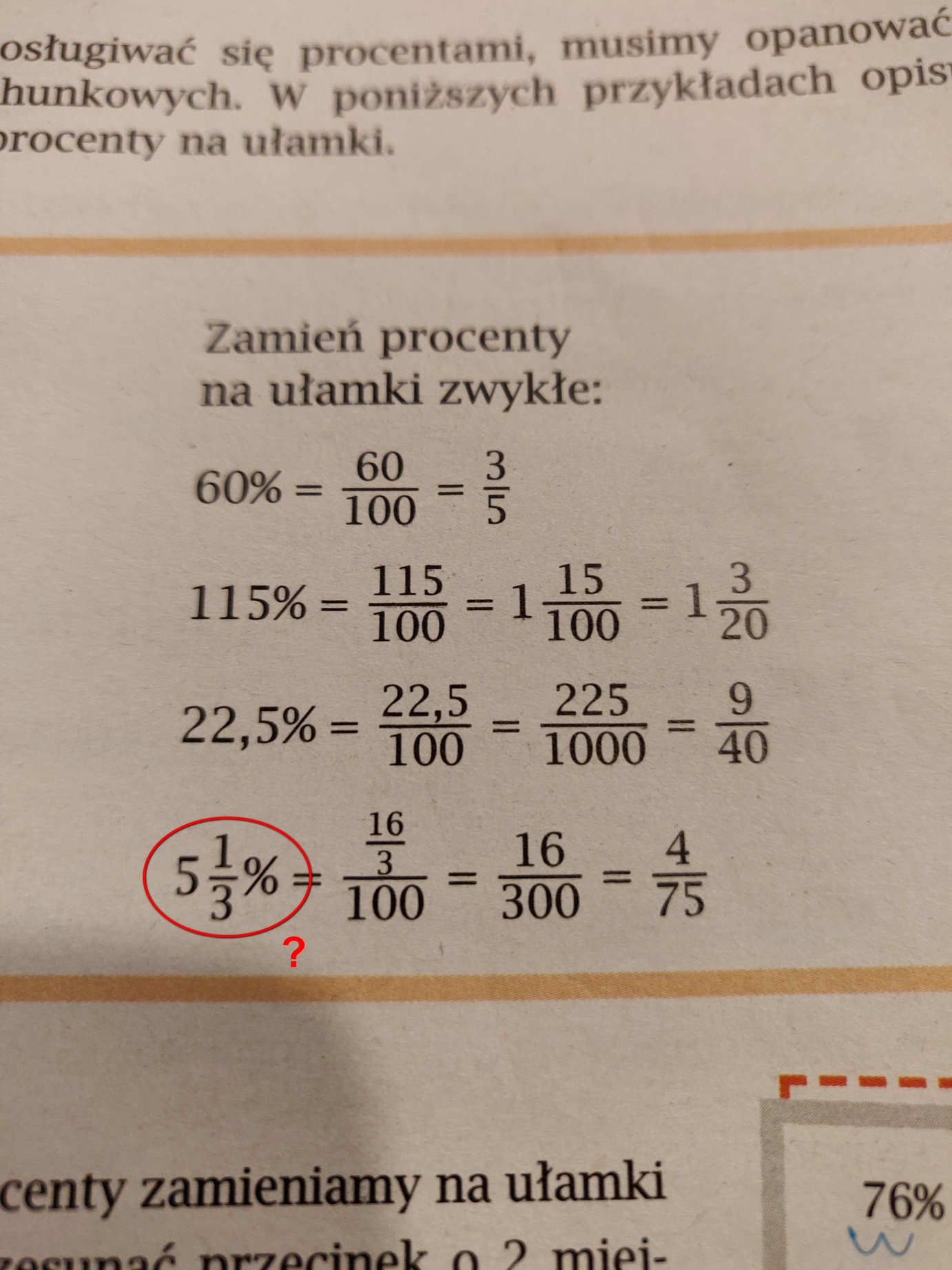 \(\displaystyle{ 5 \frac{1}{3} }\) to umowny zapis na \(\displaystyle{ 5+ \frac{1}{3} }\). I dalej to widać bo \(\displaystyle{ 5+ \frac{1}{3}= \frac{16}{3} }\). A \(\displaystyle{ \%}\) zamienia się na \(\displaystyle{ \frac{1}{100} }\).