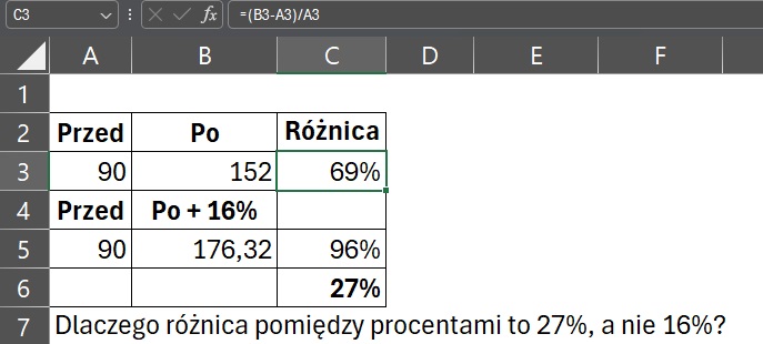 Dlaczego różnica w procentach wynosi 27%, a nie tyle o ile została podniesiona liczba = czyli 16%?