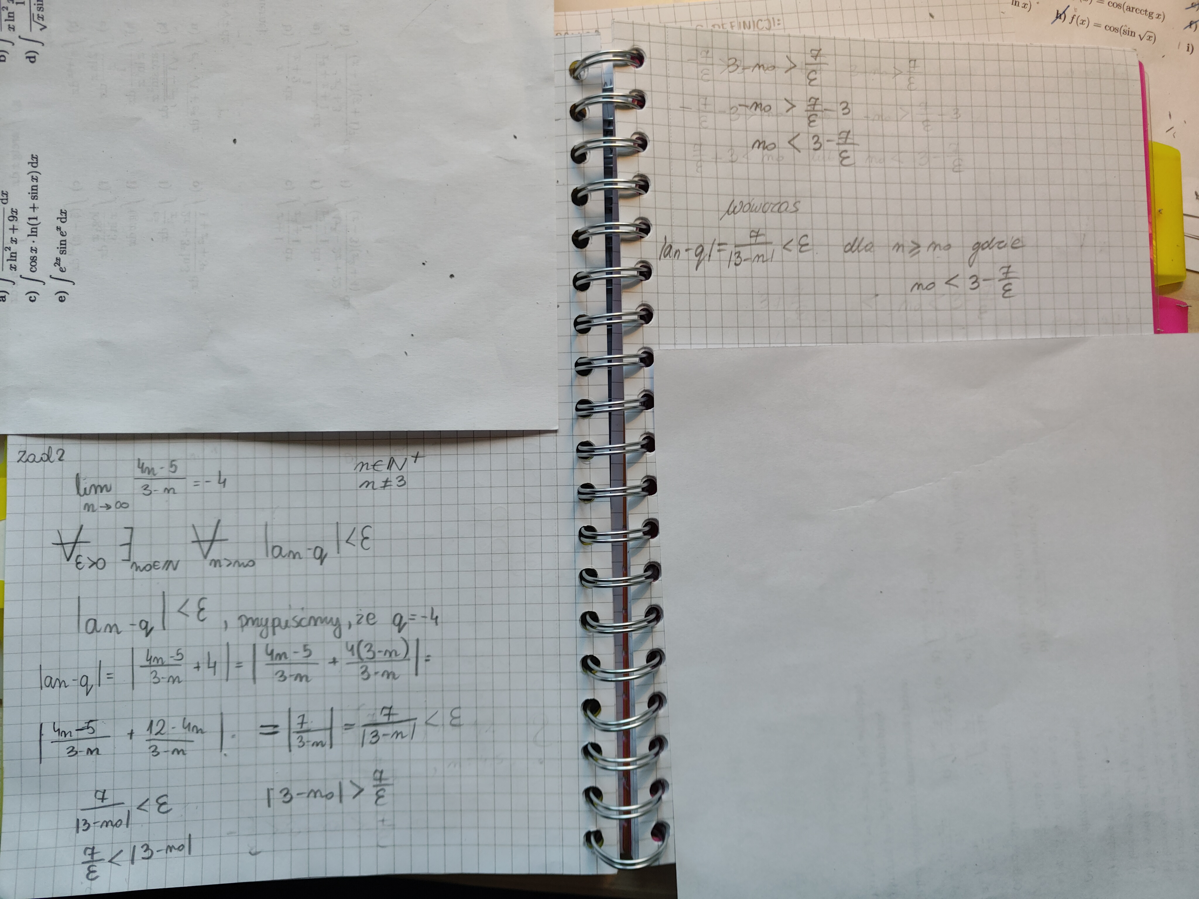 I nie tędy droga - masz wskazać konkretne \(\displaystyle{ n_0.}\) Zauważasz, że interesują cię tylko \(\displaystyle{ n>3}\) i nierówność \(\displaystyle{ \frac{7}{|3-n|}<\varepsilon}\) przyjmuje wtedy postać \(\displaystyle{ \frac{7}{n-3}<\varepsilon,}\) czyli, równoważnie, \(\displaystyle{ n-3>\frac{7}{\varepsilon},}\) czyli \(\displaystyle{ n>3+\frac{7}{\varepsilon},}\) Wystarczy zatem wziąć \(\displaystyle{ n_0=4+\left[ \frac{7}{\varepsilon}\right] }\) i zauważyć, że wtedy wszystkich \(\displaystyle{ n\ge n_0}\) zachodzi warunek \(\displaystyle{ \frac{7}{|3-n|}<\varepsilon.}\)