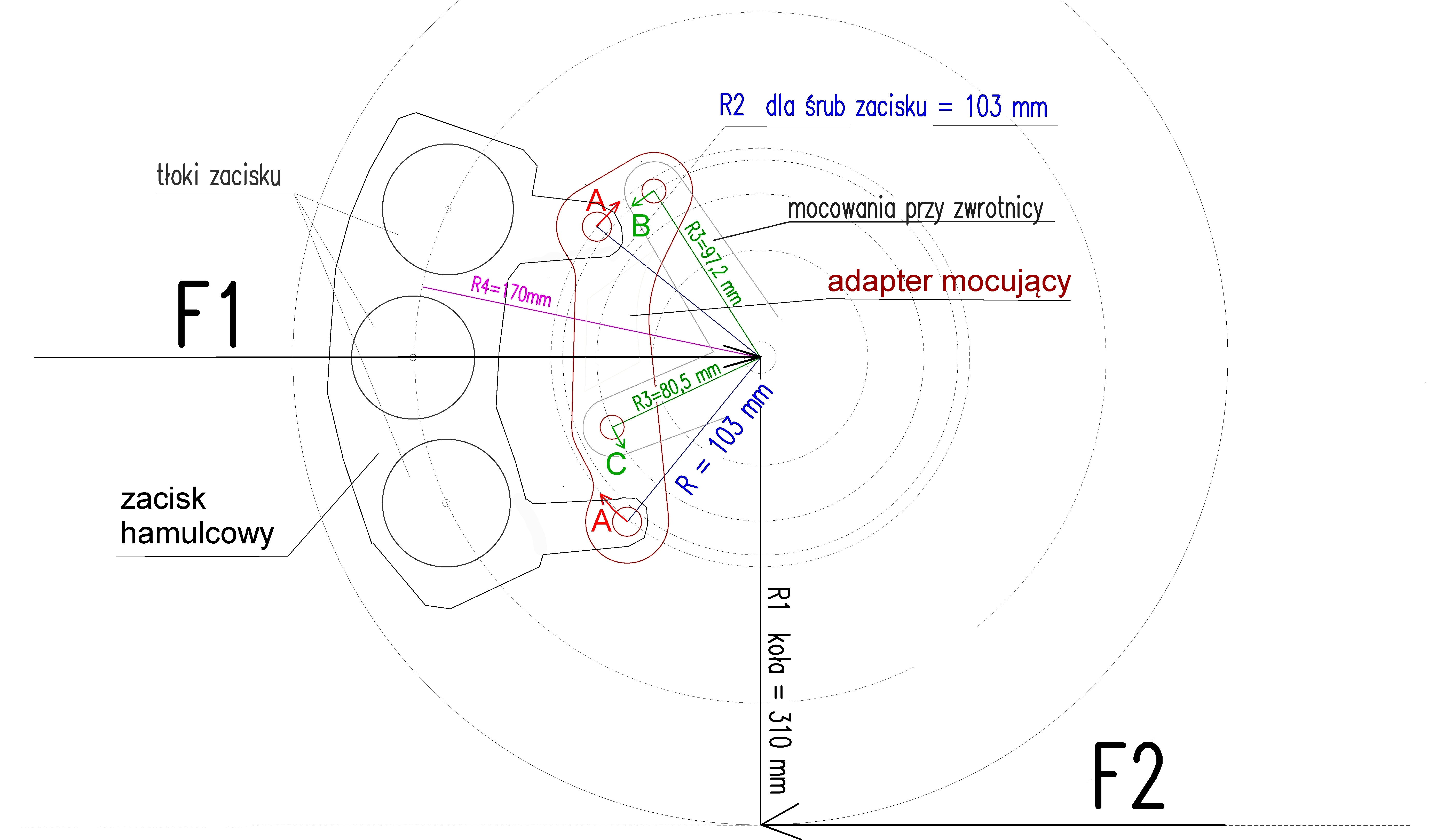 siła hamowania \(\displaystyle{ F=1700\, kg \cdot 8,55\, \frac{m}{s^2} = 14535\, N}\) dla całego samochodu, z czego \(\displaystyle{ 73\%}\) siły hamowania przypada dla hamulców przedniej osi, czyli \(\displaystyle{ 0,73\cdot 14535\, N = 10610,55\, N}\), natomiast dla pojedynczego koła połowa tej wartości, czyli w zaokrągleniu 5300 N. Poniżej schemat przedstawiający sytuację w obrębie koła. Przypuszczalnie z błędami, ale spróbujmy: Siła \(\displaystyle{ F_2}\) o wartości \(\displaystyle{ 5300\,N}\) przyłożona do ramienia będącego promieniem koła \(\displaystyle{ 0,31\,m}\) (na rysunku jako \(\displaystyle{ R_1}\), ramię kol czarny) generuje moment siły \(\displaystyle{ M=r\cdot F \rightarrow 0,31\, m \cdot 5300\, N = 1643\, Nm}\). Śruby montujące zacisk hamulcowy do zaprojektowanego adaptera znajdują się w odległości \(\displaystyle{ 103\, mm}\) od osi kola (na rysunku \(\displaystyle{ R_2}\) kol niebieski). I tu mam wątpliwości co do mojego toku obliczeń. Otóż przyjąłem, że aby owe śruby były w stanie przeciwstawić się momentowi siły przyłożonemu do ramienia \(\displaystyle{ R_2=0,103\,m}\), to muszą stawić opór silne \(\displaystyle{ 15951\,N}\), co wynika z obliczenia \(\displaystyle{ \frac{1643\,Nm}{0,103} = 15951\, N = 1626\, kg}\). Szacuję, że taki nacisk będzie wywierany na te śruby przez zacisk hamulcowy. Siła oznaczona literą A i strzałką koloru czerwonego to siła jaką dalej będą wywierały śruby na materiał, z którego będzie wykonany adapter mocujący. Proszę o pomoc i weryfikację
